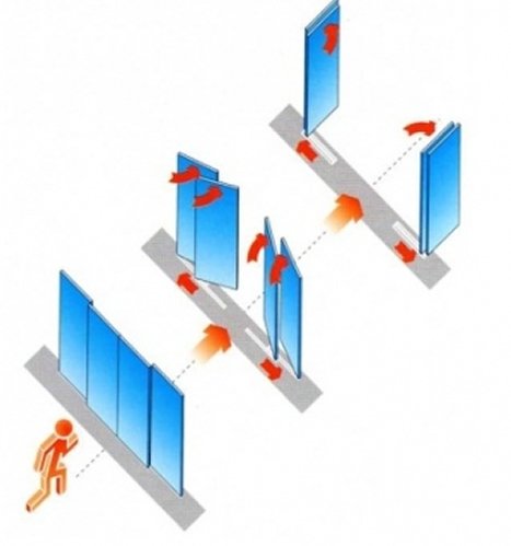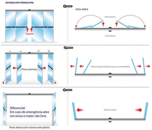 Estas portas possibilitam a abertura quase total do vão de acesso, bastando uma força maior sobre as follhas fixas e móveis da porta, o que naturalmente acontece em momento de pânico, onde as pessoas precisam sair rapidamente do ambiente, e de forma conjunta. Eventuais obstáculos detectados durante as fases de abertura e fechamento podem ser detectados por sensores “opcionais” instalados na porta.